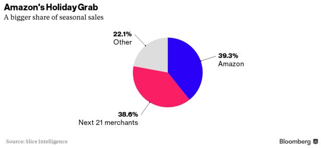 Amazon accounted for nearly 40% of online spending during the holiday season from November 1st to December 6th, according to research conducted by Slice Intelligence. The company's share increased by 140 basis points this year compared to last year, when the online retailer captured nearly 38% of American's online spend during the holiday season. Amazon's market share islarger than the web sales of the next 21 retailers combined, including Wal-Mart (NYSE:WMT), Target (NYSE:TGT), Best Buy Co. (NYSE:BBY), Macy's Inc. (NYSE:M), Home Depot Inc. (NYSE:HD), Nordstrom Inc. (NYSE:JWN) and Costco Wholesale Corp. (NASDAQ:COST).
